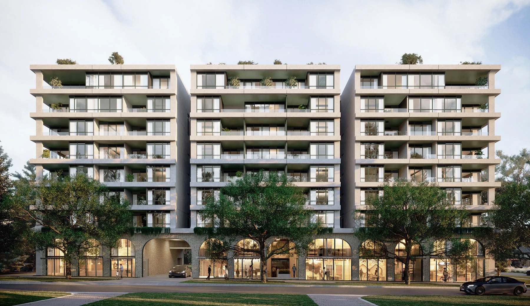 Expressed spandrels introduce depth and rhythm to the façade while also providing a layer of privacy, reducing direct sightlines from the street to the apartments above. Materials have been selected for durability and longevity, ensuring the building will age gracefully and remain a considered addition to this key city gateway.
